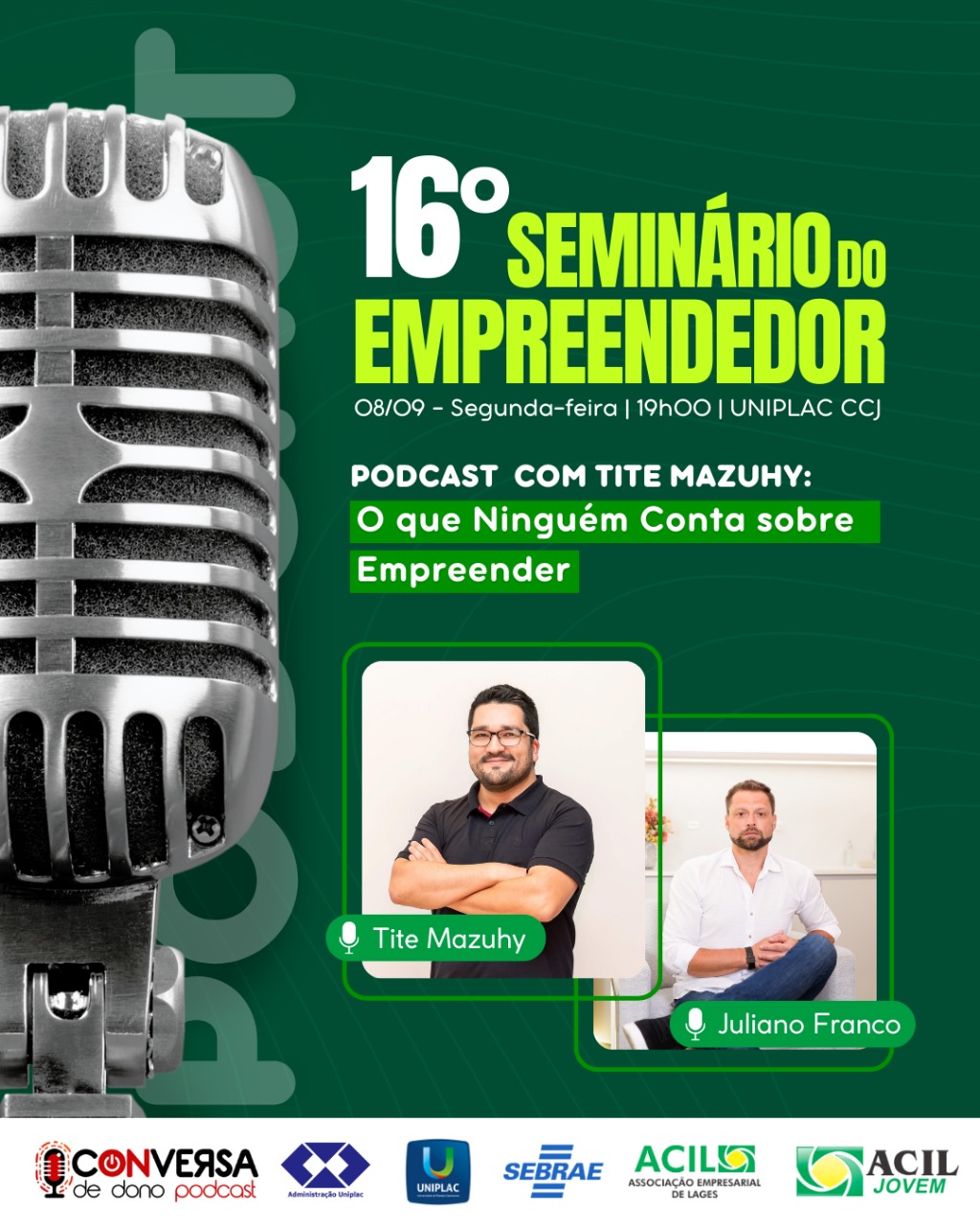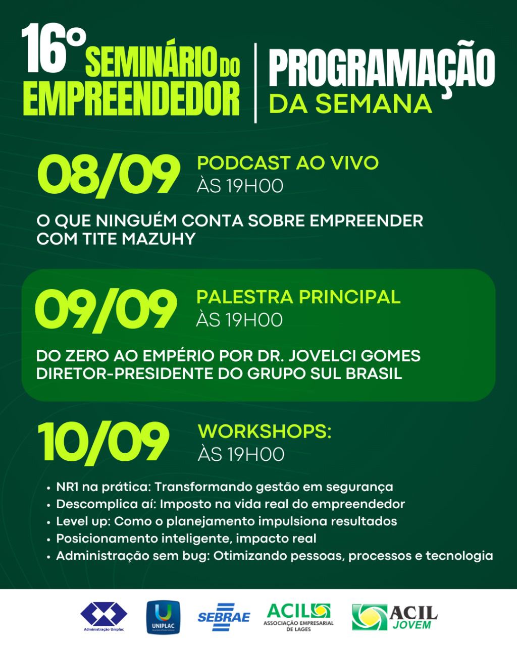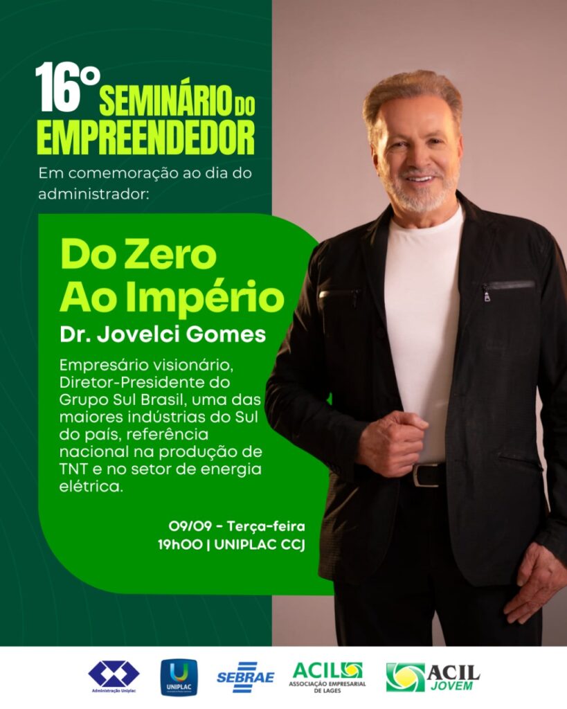 O Núcleo de Jovens Empreendedores da Associação Empresarial de Lages (ACIL) promove a 16ª edição do Seminário do Empreendedor, um dos maiores eventos da Serra Catarinense voltados à inovação e ao fomento do empreendedorismo na Serra Catarinense. A programação acontece de 8 a 10 de setembro, dentro da Semana Acadêmica de Administração da Uniplac.