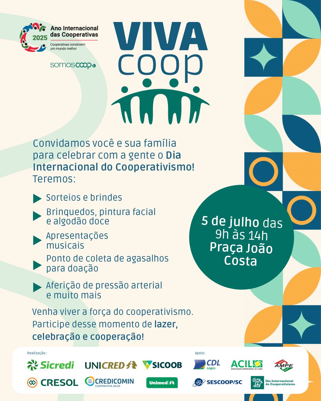 Com uma programação repleta de atrações culturais e atividades gratuitas, o Viva Coop busca proporcionar um dia de lazer, solidariedade e conscientização. Haverá apresentações musicais, brinquedos, pintura facial, distribuição de algodão doce, brindes e um ponto de coleta de agasalhos, incentivando a doação e o cuidado com o próximo.