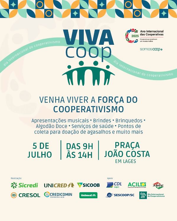 No próximo sábado, 5 de julho, a Associação Empresarial de Lages (ACIL) estará presente na Praça João Costa, das 9h às 14h, durante a realização do Viva Coop, evento especial em comemoração ao Dia Internacional do Cooperativismo. A iniciativa é promovida por diversas cooperativas da região, com o apoio de entidades locais, e tem como foco a valorização da cooperação e o fortalecimento dos laços com a comunidade.