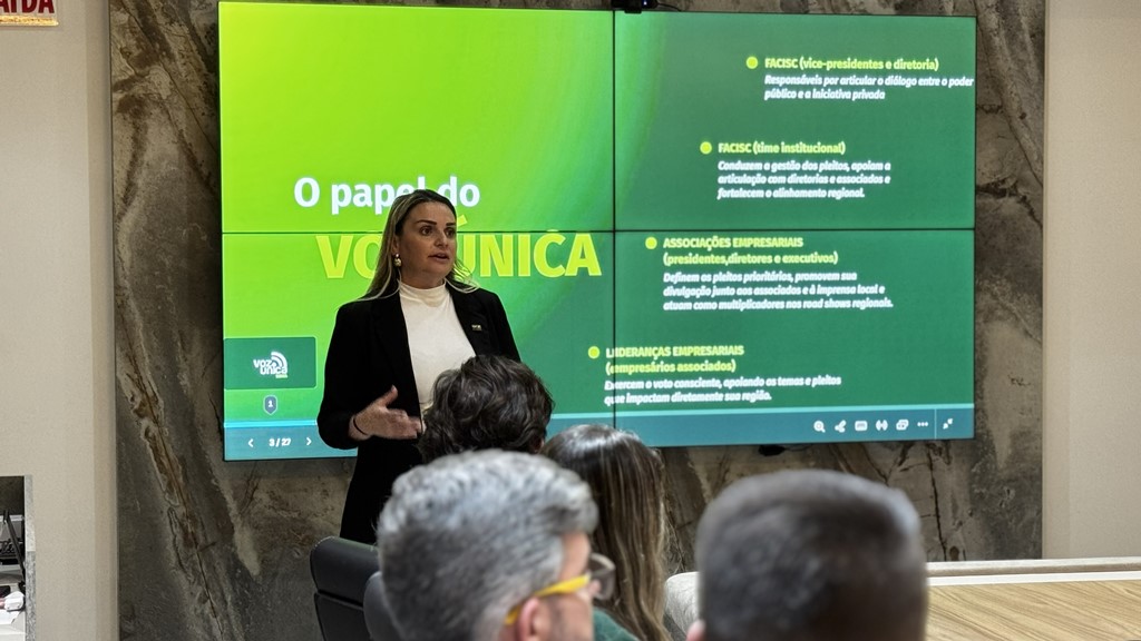 Na reunião conduzida pelo vice-presidente regional da Facisc, Antonio Carlos Floriani, foram apresentadas as novas diretrizes do Voz Única, iniciativa que reúne as demandas das 149 associações empresariais do estado. O programa passa por uma reestruturação, com o lançamento de uma plataforma digital interativa e ampliação de cinco para seis pleitos regionais prioritários, fortalecendo o diálogo entre o setor produtivo e o poder público.