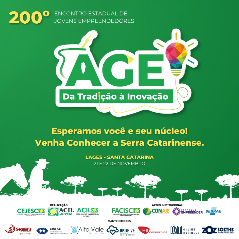 A AGE será realizada nos dias 21 e 22 de novembro, no Serrano Tênis Clube, e encerra o calendário anual do CEJESC com a eleição da nova diretoria para a gestão 2025. Intitulado Encontro Catarinense de Jovens Empreendedores – 200ª AGE CEJESC – Lages, o evento contará com uma programação extensa e rica, incluindo apresentações de cases inspiradores, visitas técnicas e amplas oportunidades de networking, reunindo mais de 250 jovens empreendedores de todas as regiões de Santa Catarina.