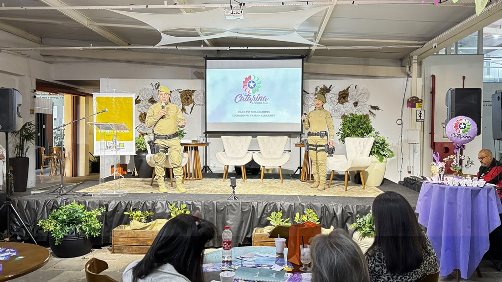 Outro momento de forte impacto foi a apresentação da soldada Yasmin Caroline Plockner Ribeiro e do cabo Tiago Abreu, da Rede Catarina. Eles compartilharam trechos reais de chamadas feitas por mulheres e crianças pedindo socorro à Polícia Militar. Em seguida, explicaram o funcionamento do botão do pânico, disponível no aplicativo PMSC Cidadão, que está disponível para quem possui medida protetiva e permite acionar a polícia de forma silenciosa e prioritária, utilizando a localização do celular para garantir resposta rápida.