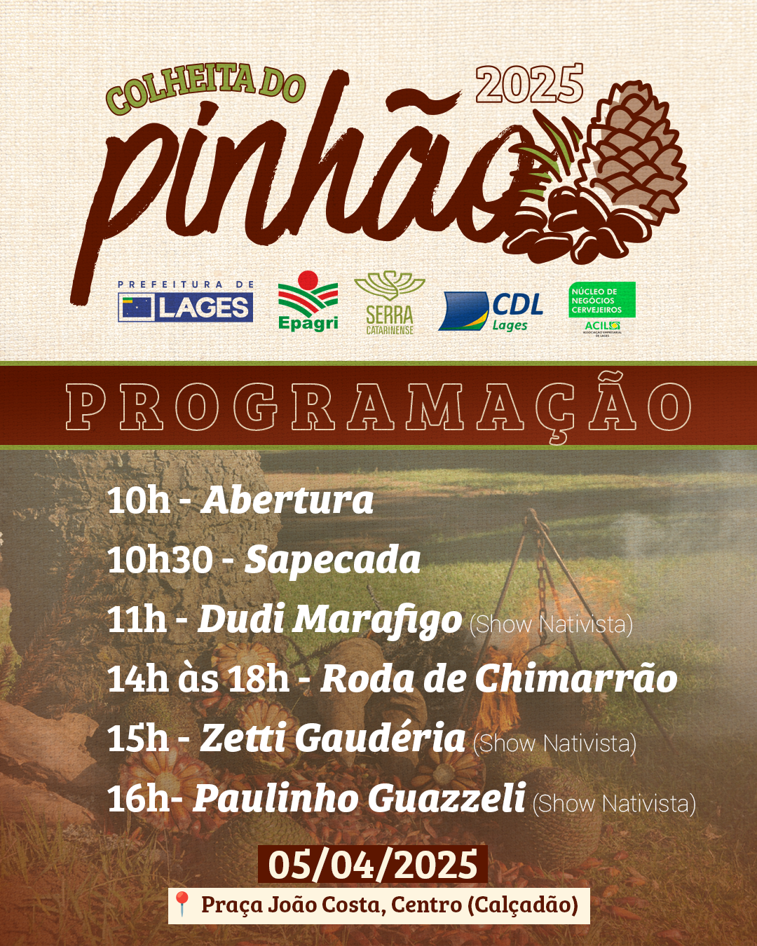 A programação promete um dia repleto de cultura e sabores, com atrações musicais, pratos à base de pinhão, roda de chimarrão e, é claro, a tradicional sapecada de pinhão. E para acompanhar a experiência gastronômica, os visitantes poderão degustar uma seleção especial de cervejas artesanais que serão comercializadas pelas cervejarias nucleadas da ACIL: Eiswasser, GuedBeer, Serra Forte e Urupema.