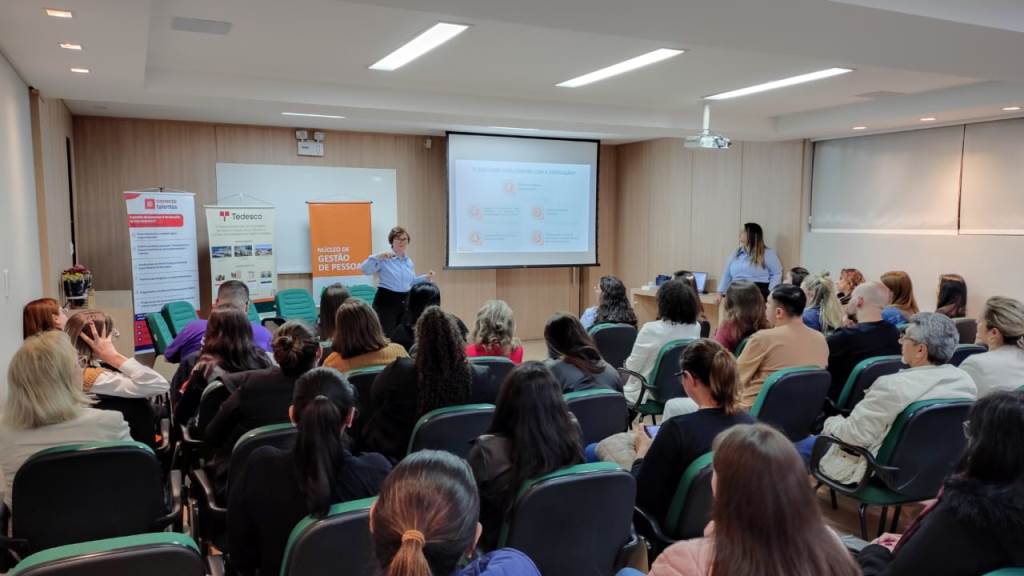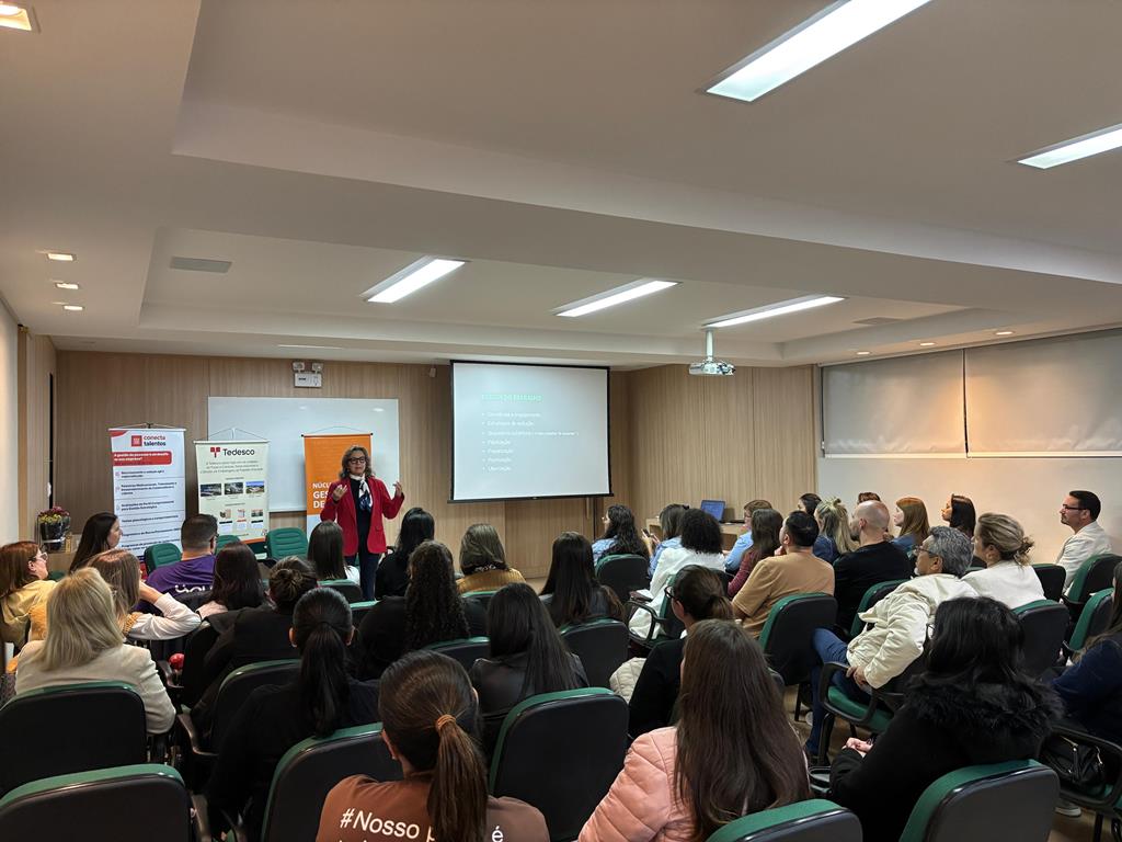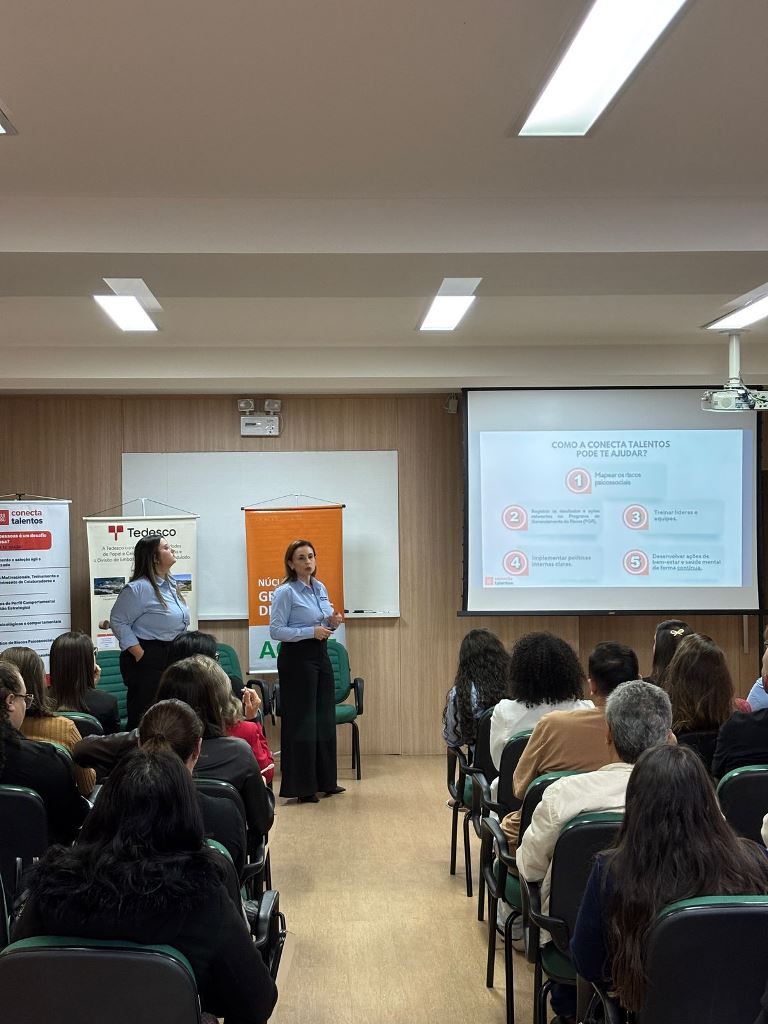 A primeira palestra, “A NR1 é uma obrigação. Como torná-la uma ação estratégica para o seu negócio”, foi ministrada por Luana Ramos e Diane Aglae Perkowski, que ressaltaram que todas as empresas, independentemente do porte, deverão mapear e mitigar riscos psicossociais. Fatores como assédio moral, carga de trabalho excessiva e falta de reconhecimento, além de comprometerem a saúde dos colaboradores, também geram prejuízos significativos à produtividade e à reputação institucional.