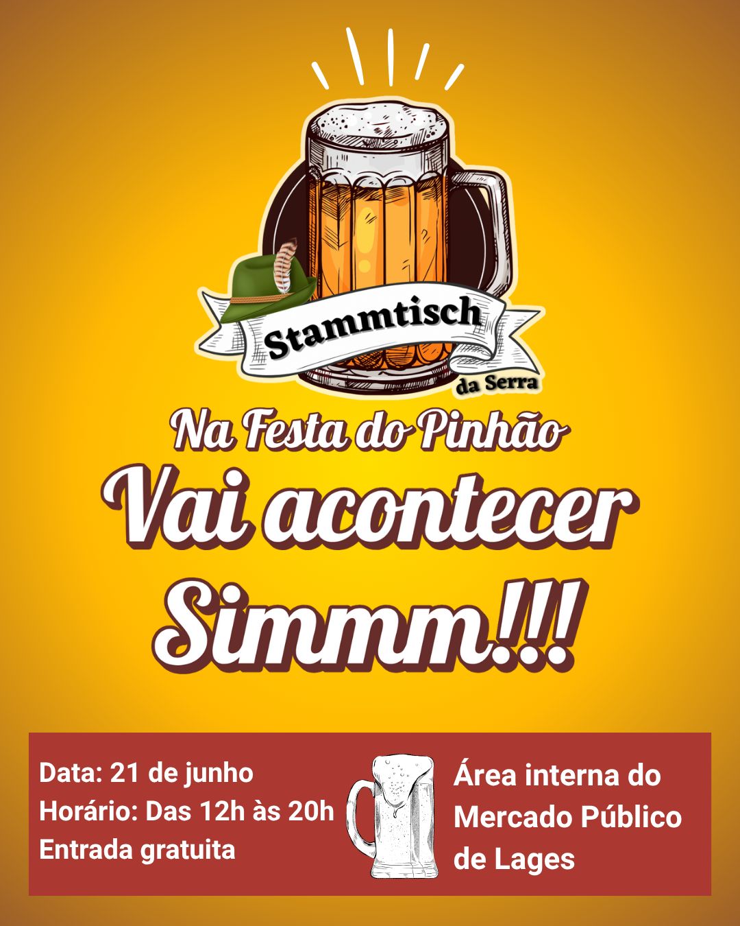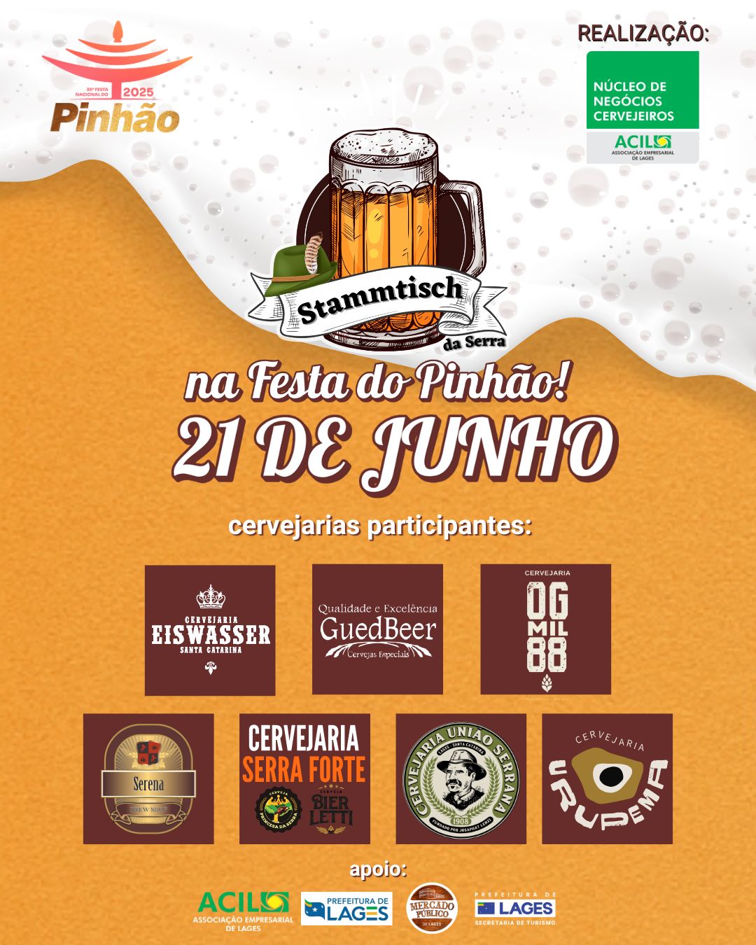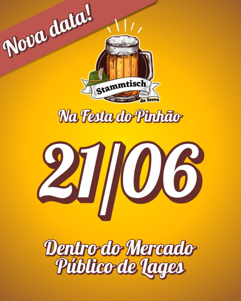 Após o cancelamento devido ao mau tempo, o Stammtisch da Serra na Festa do Pinhão, tradicional festival de cerveja artesanal promovido pelo Núcleo de Negócios Cervejeiros da Associação Empresarial de Lages (ACIL), já tem nova data e local confirmados. A edição será neste sábado, 21 de junho, das 12h às 20h, dentro do Mercado Público de Lages.