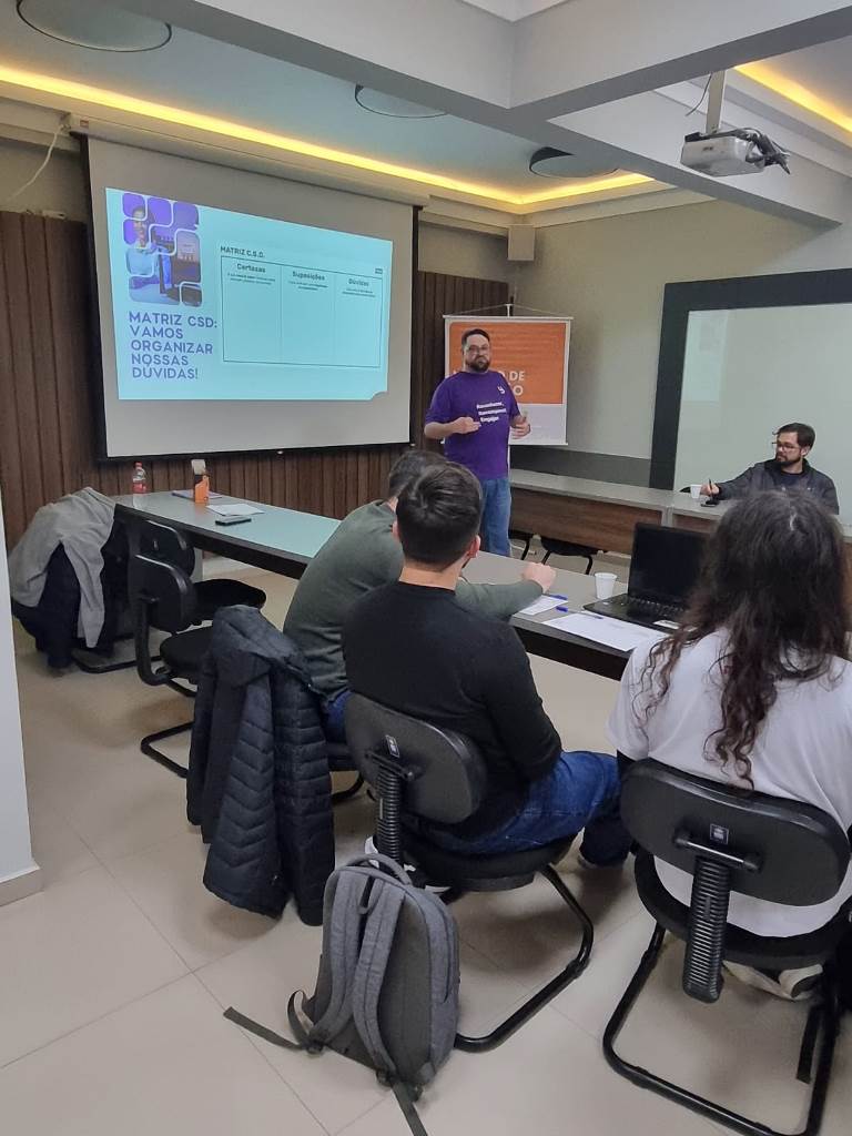 Durante o workshop, Cevey apresentou ferramentas práticas como Lean Startup, Design Thinking, Scrum e o Canvas de Hipóteses, destacando como essas metodologias podem ser aplicadas de forma ágil para validar ideias e acelerar resultados.